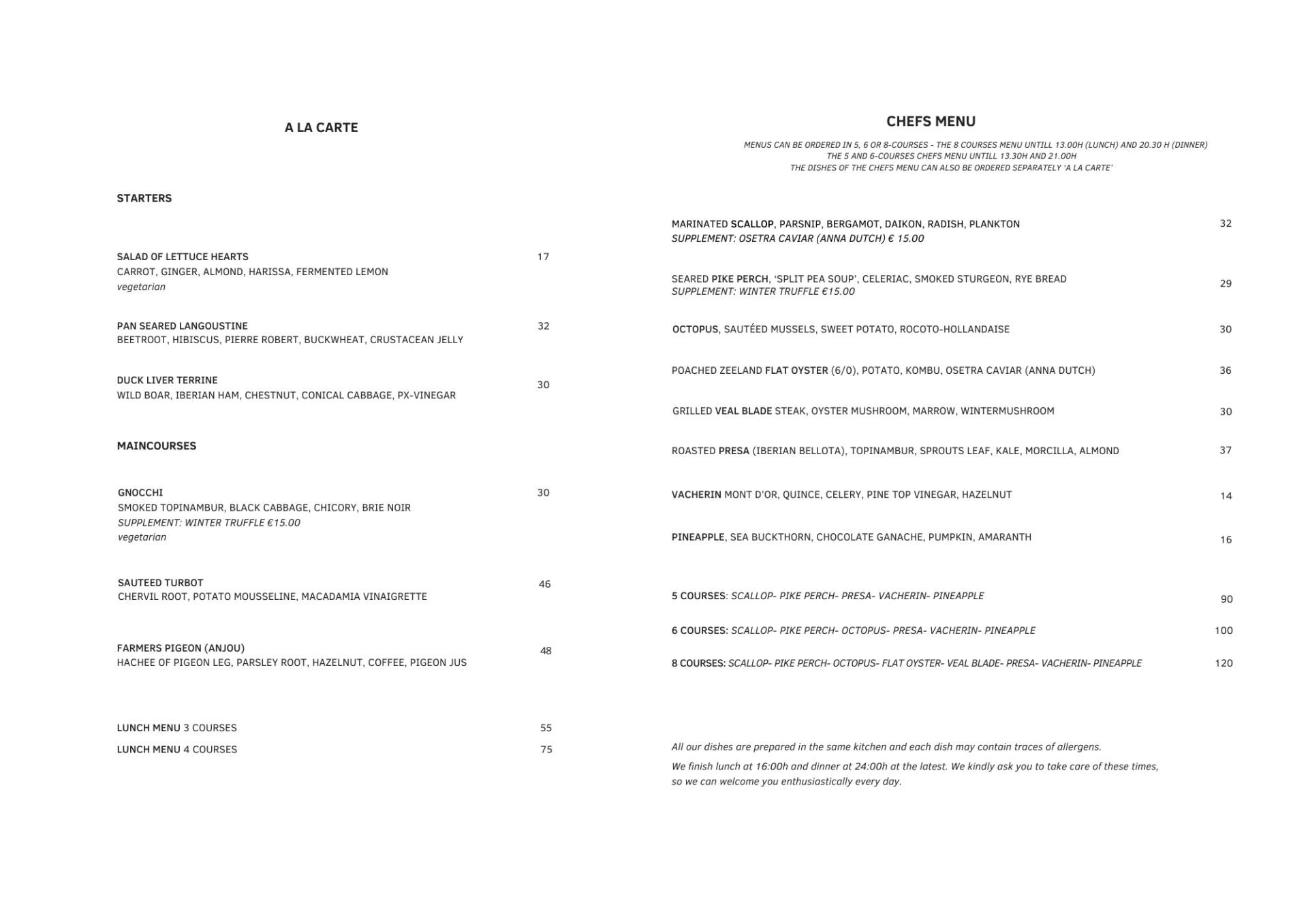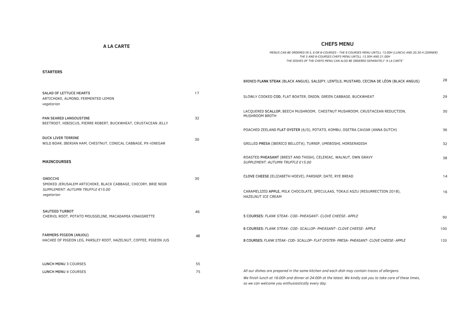 Note: After your lunch or dinner you can of course enjoy a cup of coffee / drink before we wrap up. For lunch this is no later than 4:00 PM and dinner at 12:00 AM. We kindly ask you to respect these times, so that we can welcome you enthusiastically every day.