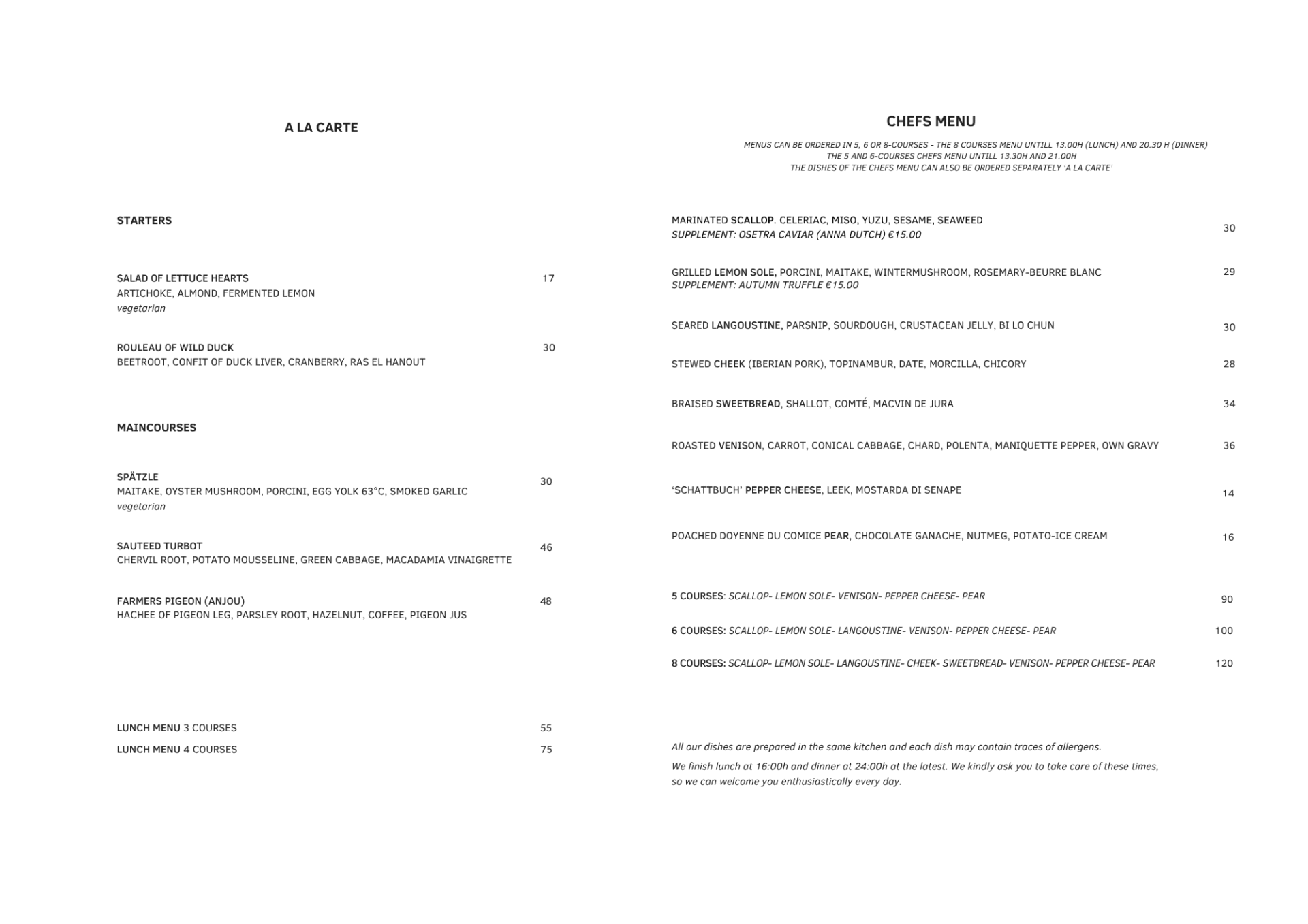 Note: After your lunch or dinner you can of course enjoy a cup of coffee / drink before we wrap up. For lunch this is no later than 4:00 PM and dinner at 12:00 AM. We kindly ask you to respect these times, so that we can welcome you enthusiastically every day.